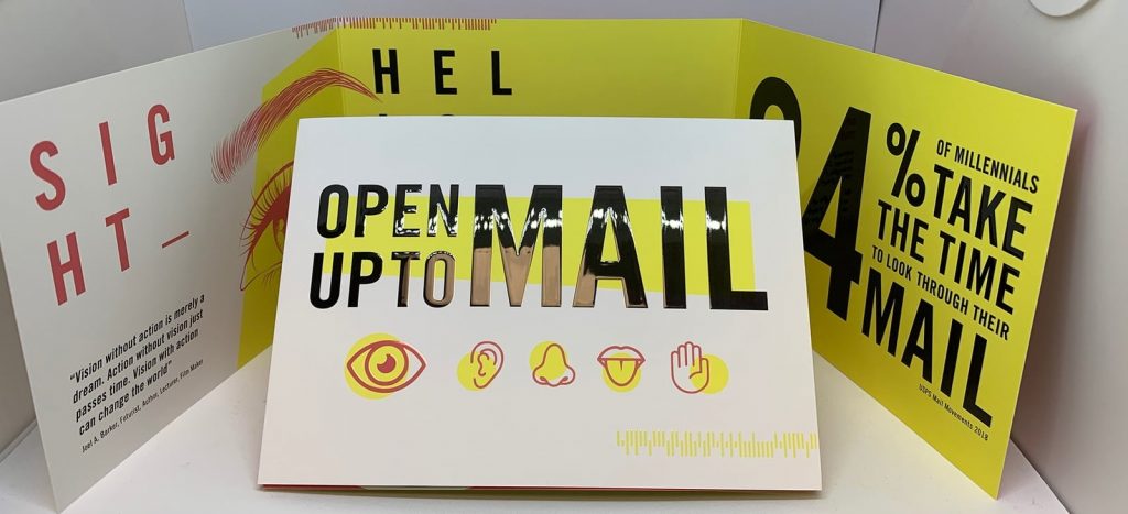 Kellie: OPEN UP TO MAIL is a campaign promoting the creativity, success and effectiveness of direct mail. It is an awareness campaign calling all designers, agencies, marketers and interested people to be re-inspired by the power of direct mail. We wanted to highlight the sensory attributes of mail. It’s ability to connect through the five senses: touch, sight, smell, taste and sound.
