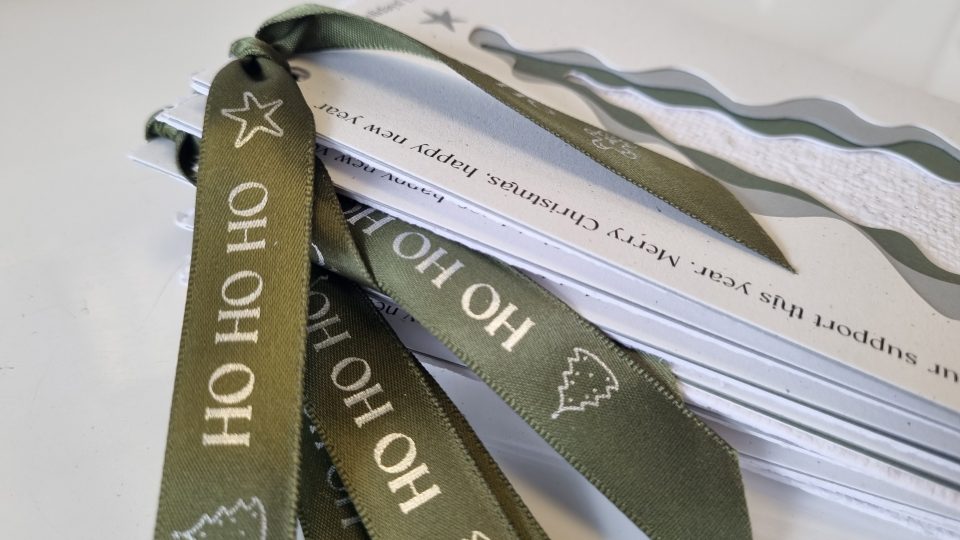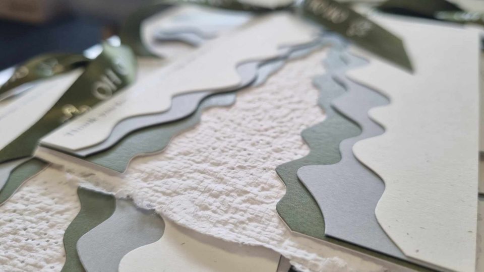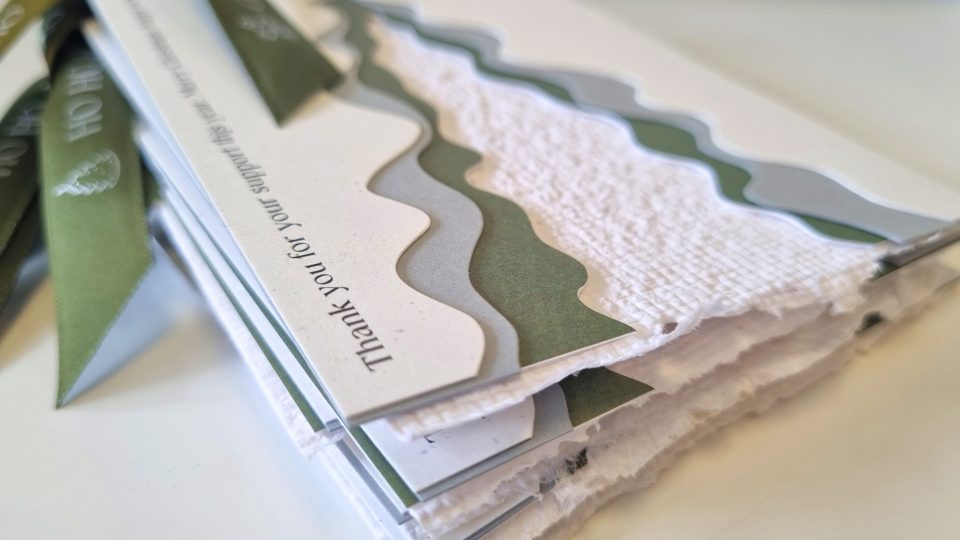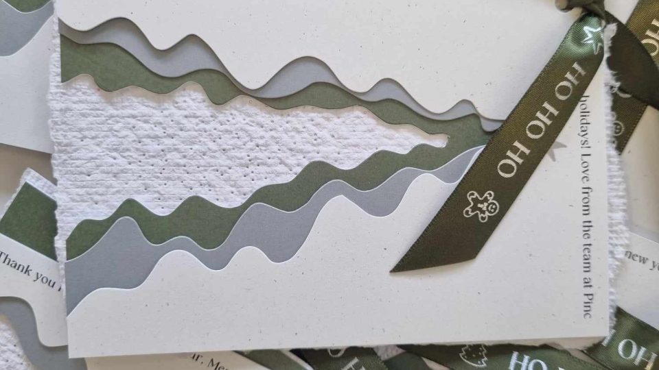 For our 2023 Christmas cards, we went with a reuse and recycle vibe. The end result was this four-layer card held together with green ribbon and featuring a die cut Christmas tree shape. The card uses some of our favourite BJ Ball stocks: Evergreen Environment and Mohawk Superfine. The second layer features an unprinted grey stock, which was actually some leftover samples. The bottom stock is our own paper-making, made using recycled off-cuts and stamped with a silver foil.