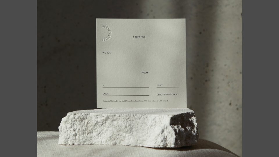 Melbourne based homewares & living retailer, Design Stuff, required a new solution for their gift cards. The resulting packaging design features a perforated envelope and triplex gift card both with deboss details on Colorplan Pale Grey. The resulting design creates a sense of movement using type, along with a stylish, spacious feel.