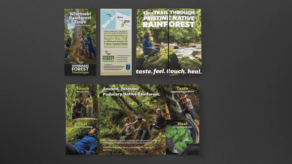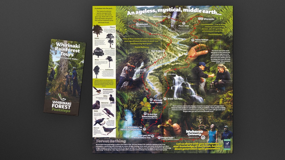 Whirinaki Forest is one of the last untouched podocarp forests in New Zealand. A podocarp forest comprises a mixture of tall and short native trees with an understorey of shrubs, plants and ferns. Unfortunately, over the last 120 years, many of these forests have been cleared for farming due to the rich nature of the soil. This brochure is to promote a new eco tourism guided walking tour through Whirinaki Forest. The folded size of the brochure is DL. It then unfolds three-times culminating in the large open spread (398 x 420mm). This shows the tour route plus some of the natural flora and birdlife highlights. We specifically chose uncoated paper to create an organic look and feel to enhance the story. For the weight, we selected 150gsm to mitigate show-through. One key challenge for the printer was to retain clarity in the fantastic photography by making allowance for dot gain on the uncoated stock.