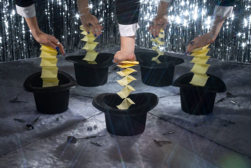 the famous mac ‘wheel of death’ represented by a hand-held windmill, the magicians hat—the place from which clients believe ideas are simply conjured…