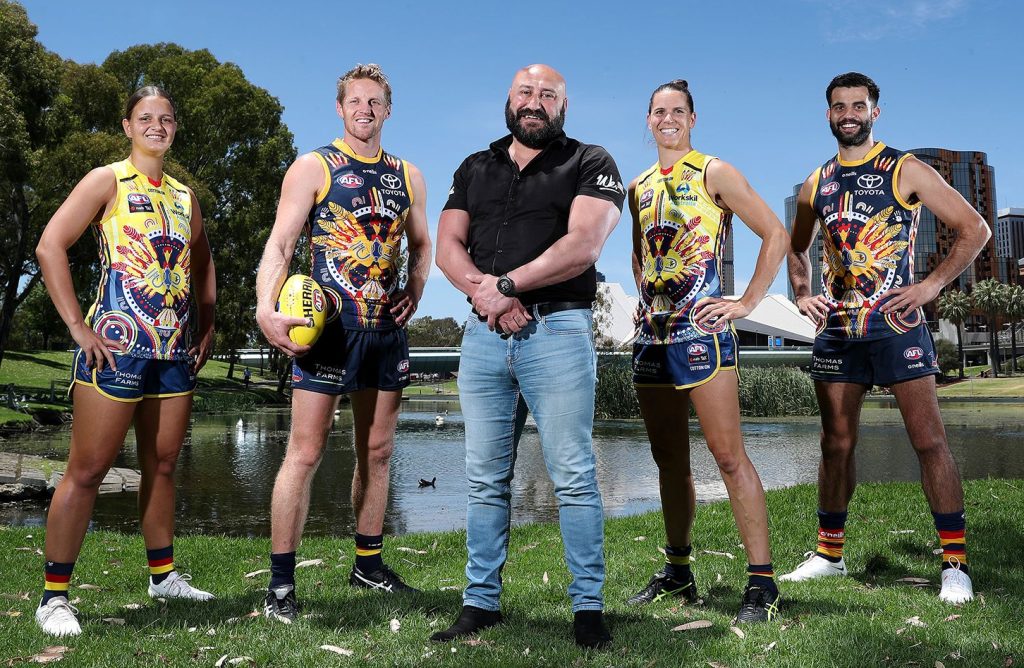 Caruso brought his expertise to the design of the AFL Adelaide Crows 2022 Indigenous guernsey. It highlights the coming together of the men’s and women’s teams on their reconciliation journey, as well as acknowledging the impact that the many members of the Crows family have left on the Club since 1991.