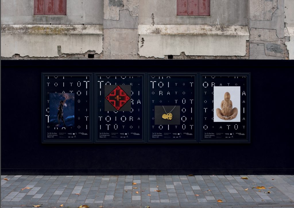 Auckland based agency, Extended Whānau, designed the brand identity and accompanying communications. The overarching concept was the Māori creation narrative. The visual expression, employing patterns of type repeating the words Toi Tū Toi Ora set against a black & white colour scheme. This colour scheme represents the concepts of Māori celestial origins and the shift from darkness to light. The type forms themselves mimic woven and carved art. Plus, set amongst this typographic matrix, are a diverse range of images of art from the exhibition.